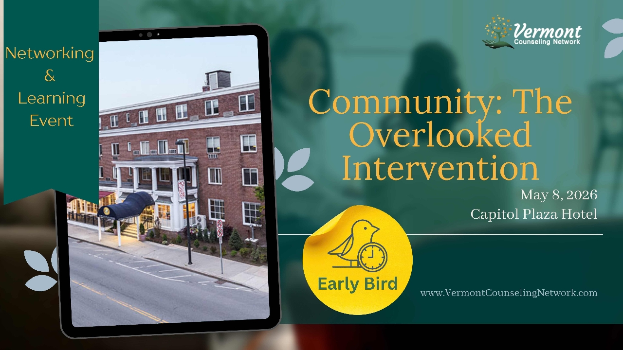 Don’t learn in isolation. We’ve intentionally built-in dedicated time before the session and during extended breaks for you to step away from the screen and back into the room. Connect with fellow Vermont practitioners, share resources, and build the professional relationships that sustain a long-term career in mental health.
